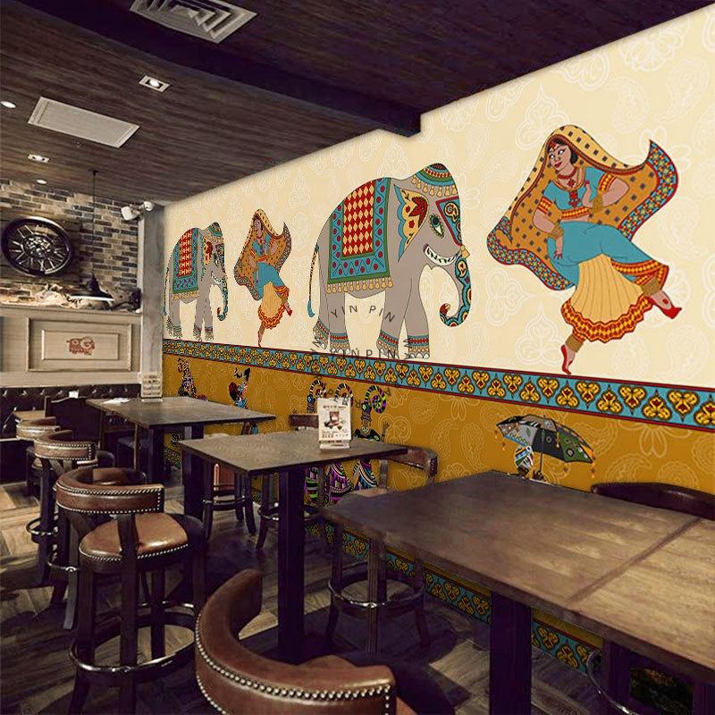 วอลเปเปอร์ลายภาพจิตรกรรมฝาผนังร้านอาหารสไตล์ไทยเอเชียตะวันออกเฉียงใต้