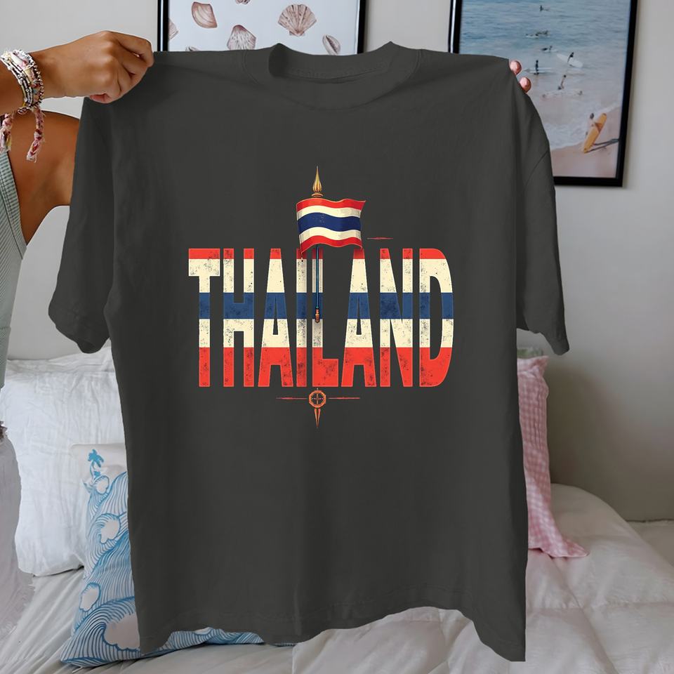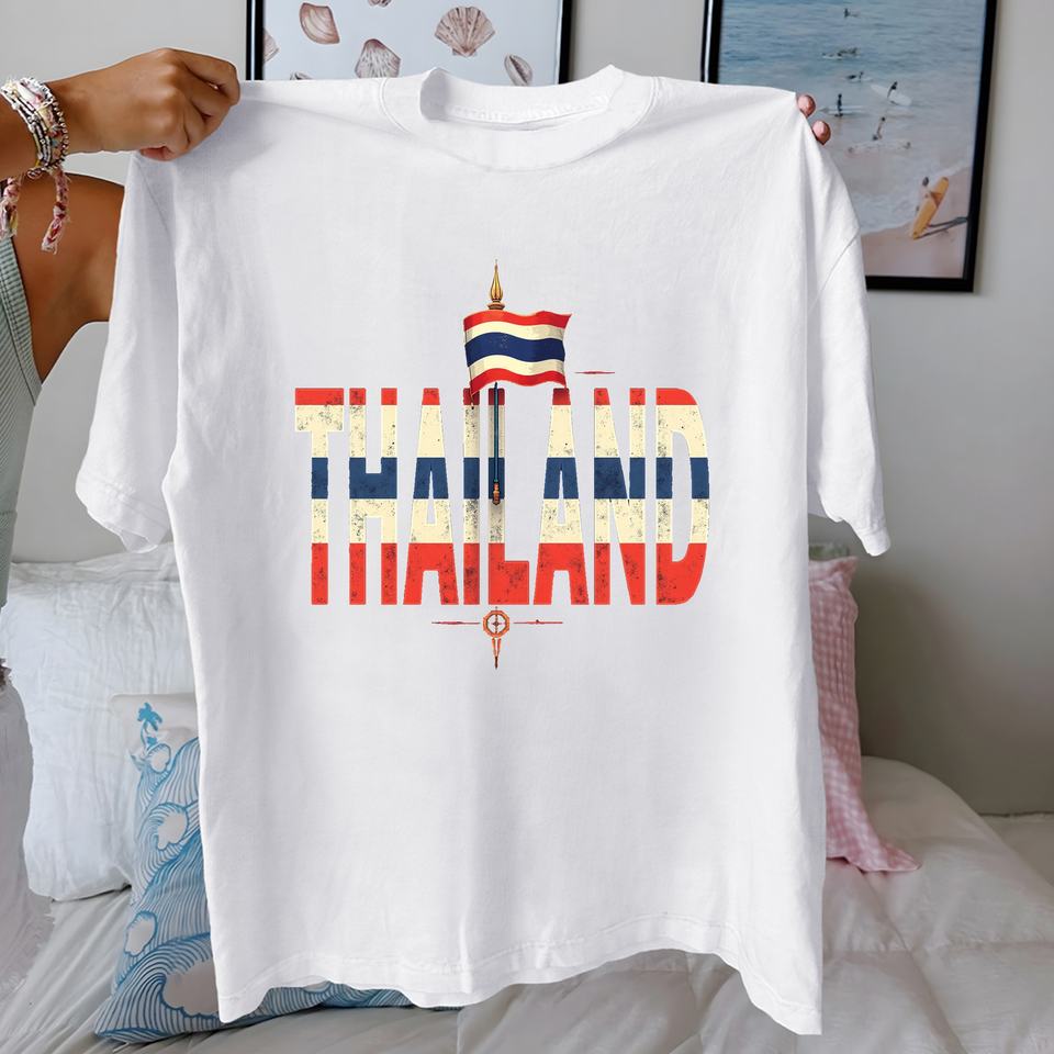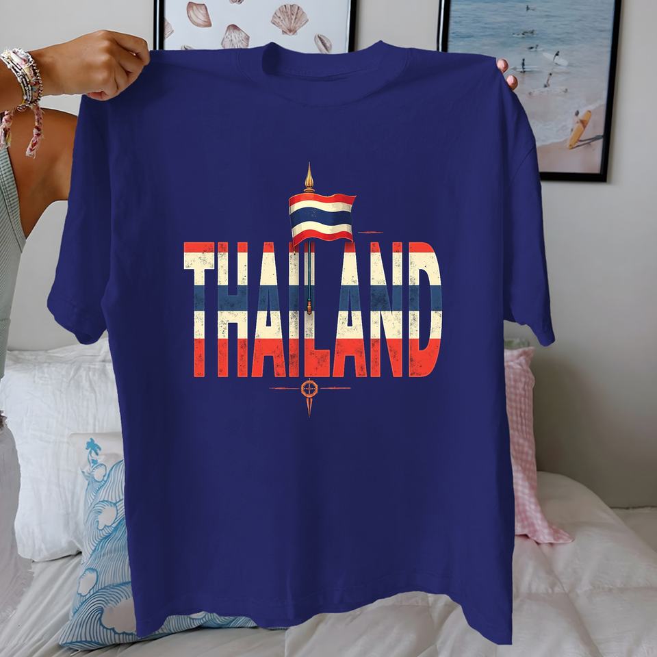 เสื้อยืดแขนสั้นคอกลมผ้าถักพิมพ์ลายธงชาติไทยสไตล์วินเทจสำหรับผู้หญิง ผ้าฝ้ายแท้ 100% สวมใส่สบายสไตล์ลำลอง