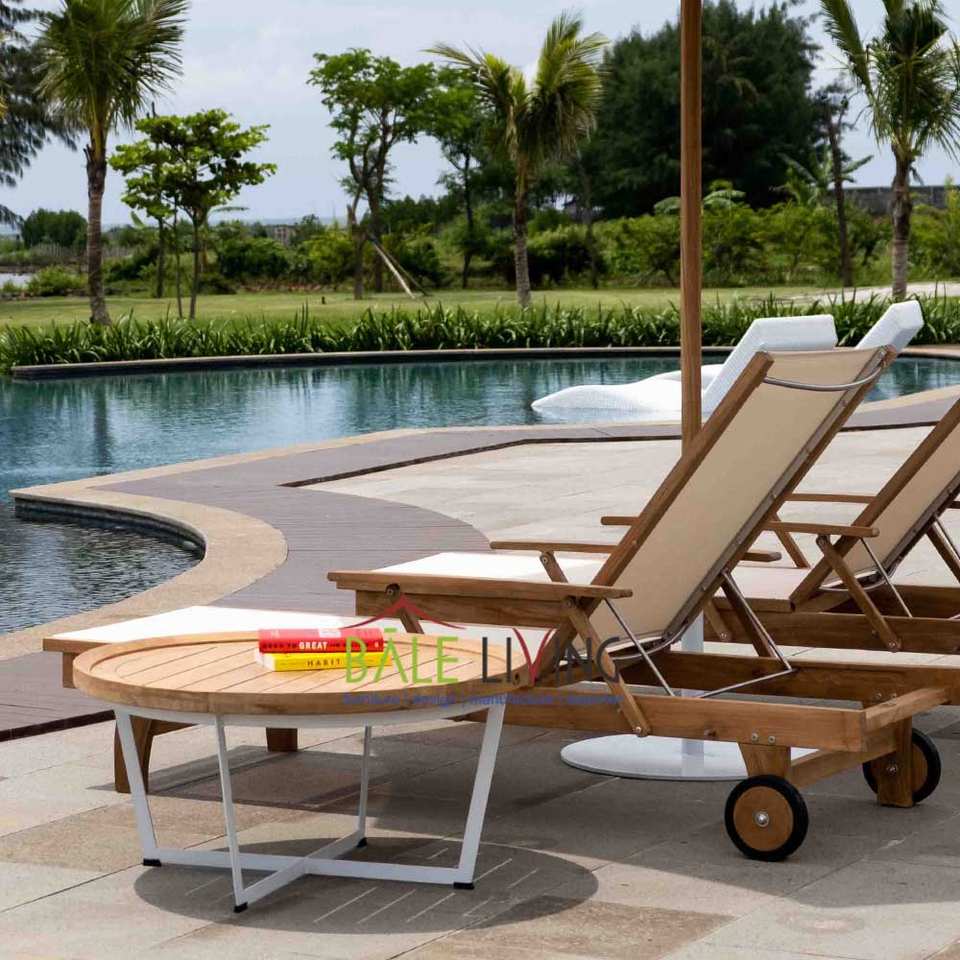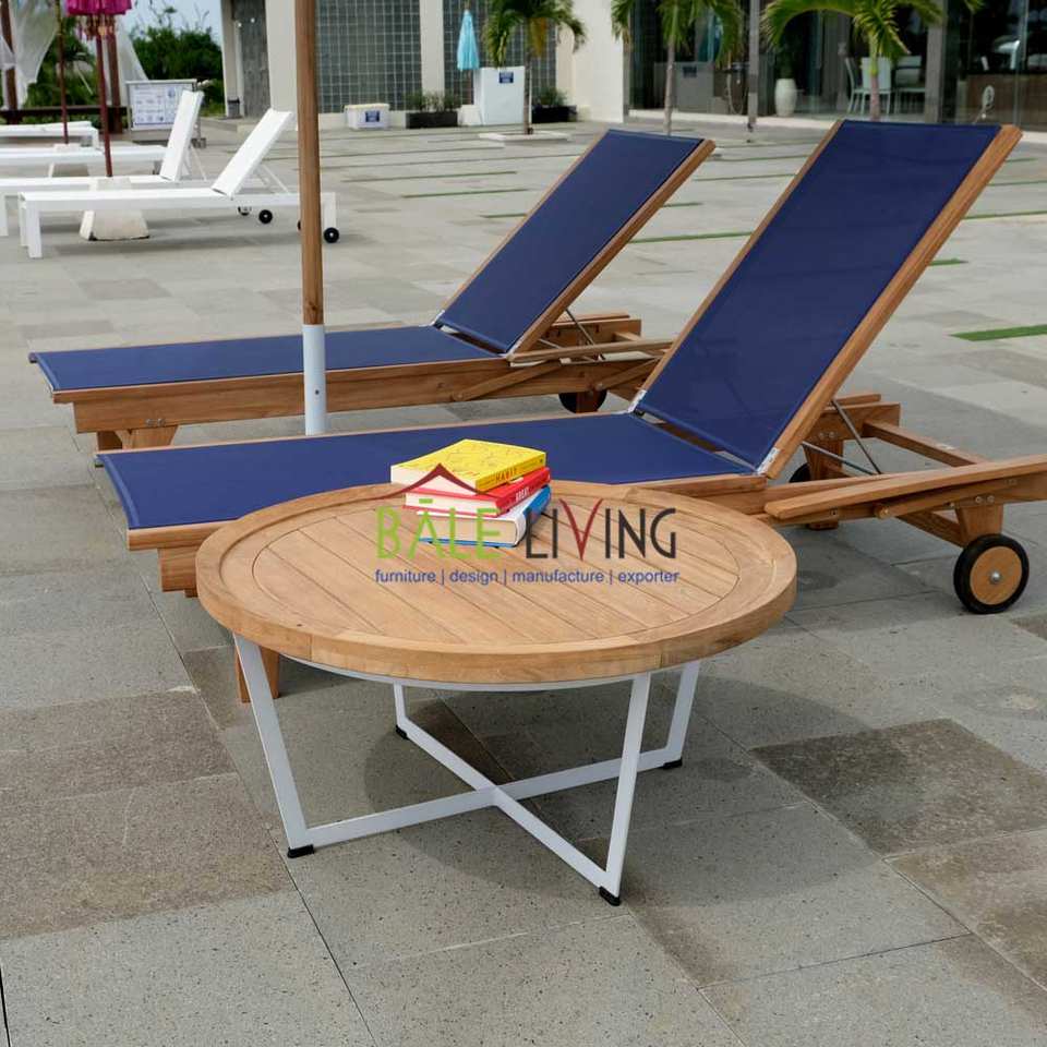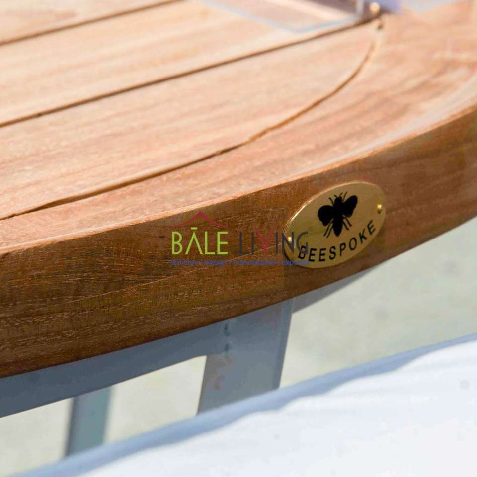โต๊ะกลมแคทัลลินาโดดเด่นด้วยฐานอะลูมิเนียมที่แข็งแรง ผสมผสานกับไม้สักและเหล็กที่หรูหรา เหมาะสำหรับการใช้งานกลางแจ้ง