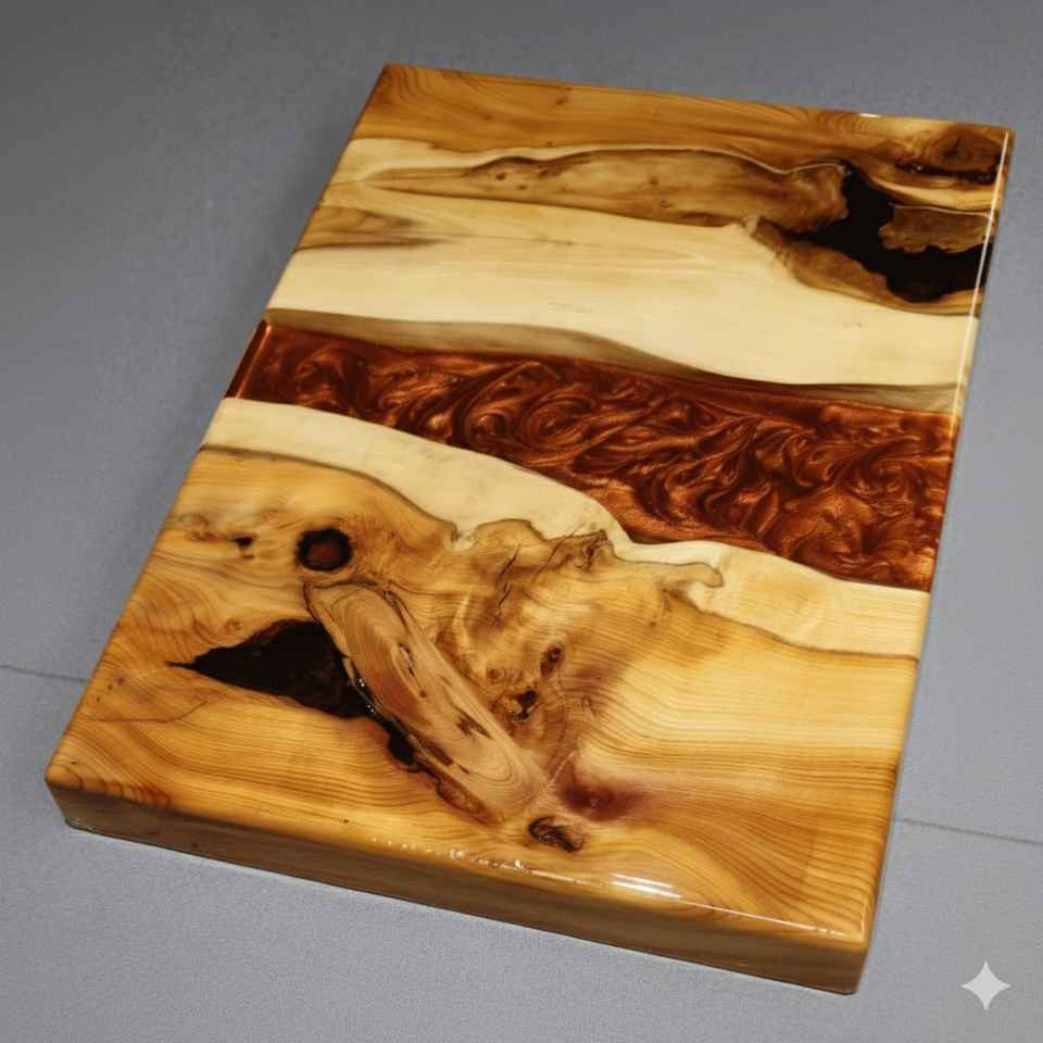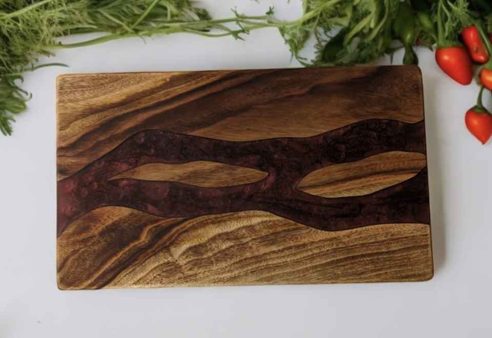 เขียงที่แสดงในนี้ทำด้วยมือทำจากไม้เนื้อแข็งธรรมชาติและอีพอกซีเรซินทั้งสองวัสดุนี้