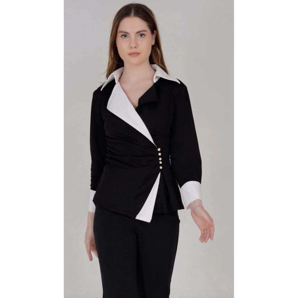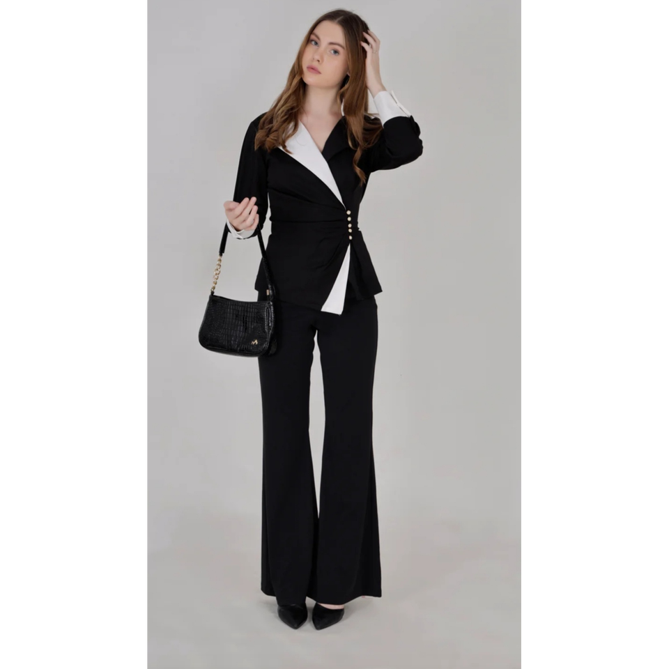 ชุดเซ็ตเสื้อเบลเซอร์ปกปีกนกแบบอสมมาตรสีเดียวตัดกันสไตล์เอ็กเซคคิวทีฟนัวร์ พร้อมกางเกงขาบาน