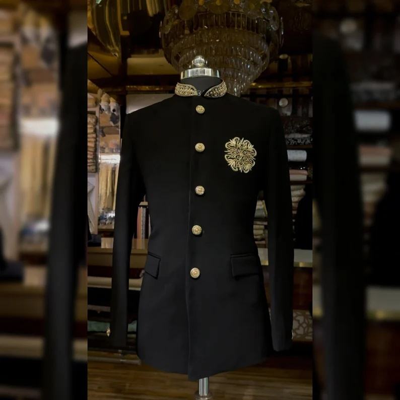 ชุดสูทแฟชั่นสีดำสำหรับผู้ชายชุดทักซิโด้เข้ารูปงานแต่งงานทักซิโด้คอตั้ง2ชิ้น