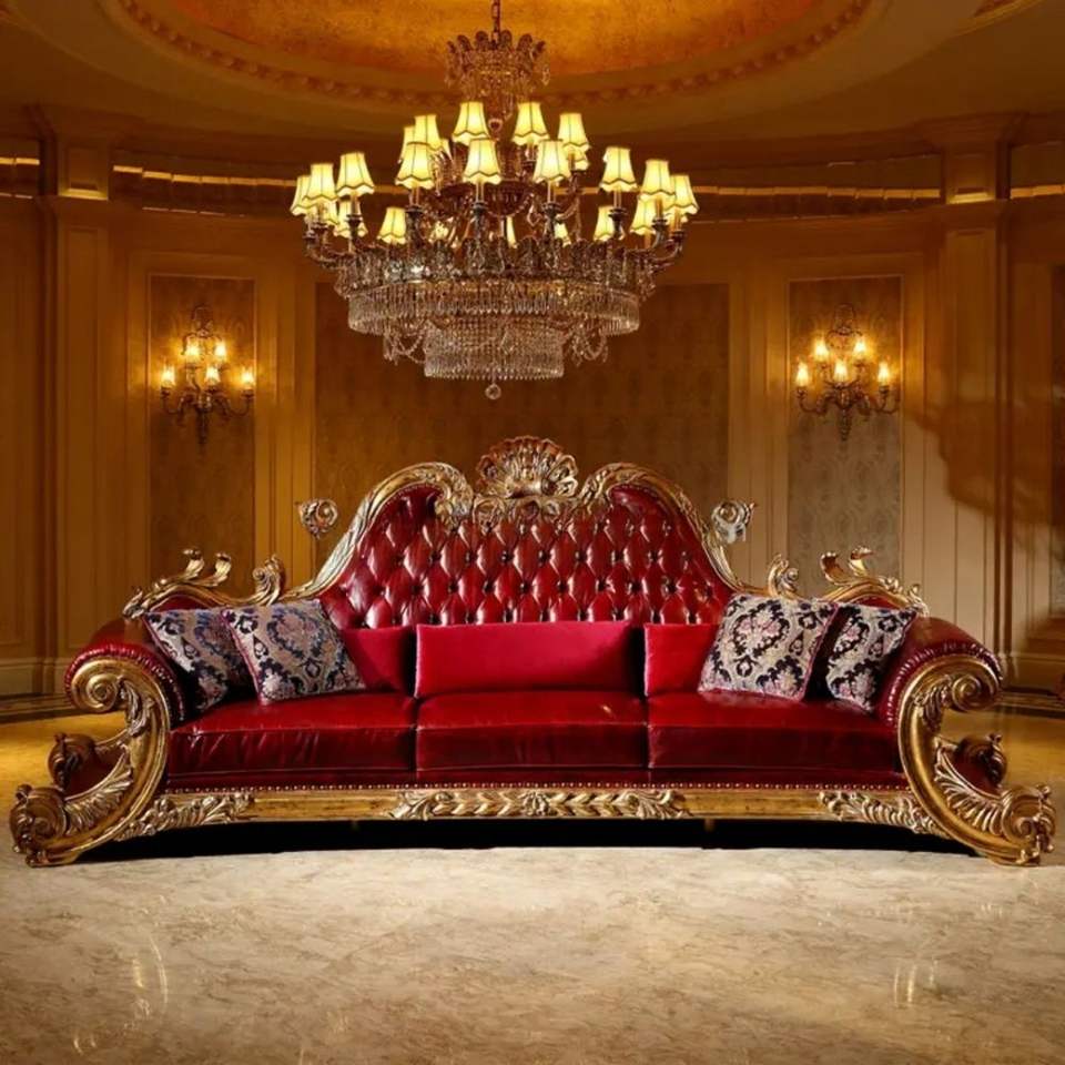 ชุดโซฟาไม้มะฮอกกานีแกะสลักสีแดงทองหรูหราทรง S แบบทรานซิชั่น พร้อมฟองน้ำบุอย่างดี สำหรับห้องนั่งเล่น