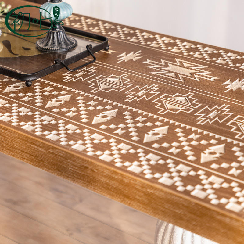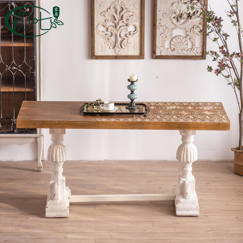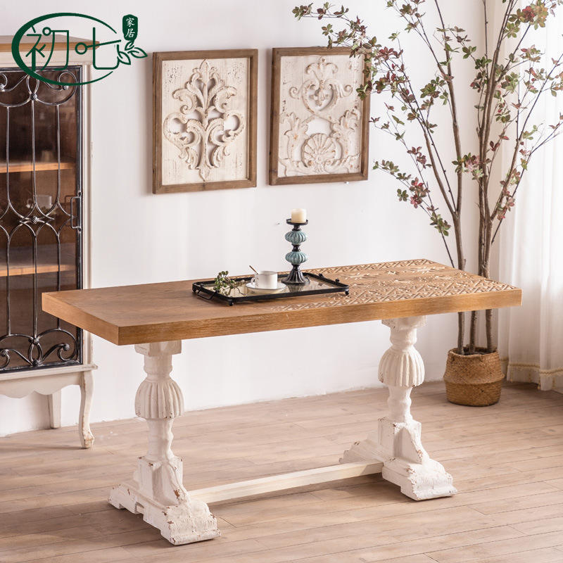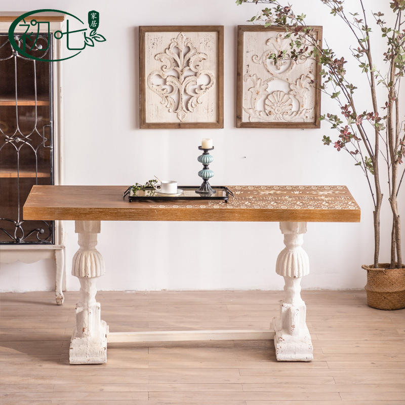 โต๊ะรับประทานอาหารไม้แกะสลักสไตล์อเมริกันแบบวันที่เจ็ด 6 ที่นั่ง สไตล์เรโทร ดีไซน์เก่าแบบดั้งเดิม ใช้ได้หลากหลายในบ้าน