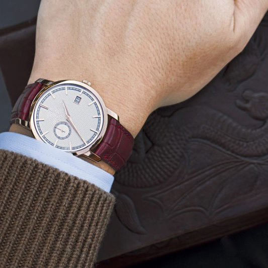 ปฏิทินขนาดเล็กที่ตำแหน่งสามนาฬิกา และเข็มวินาทีขนาดเล็กที่ตำแหน่งเก้านาฬิกา ช่วยเสริมกันและทำให้ดูสมบูรณ์แบบ นาฬิกาข้อมือผู้ชายแบบกลไก