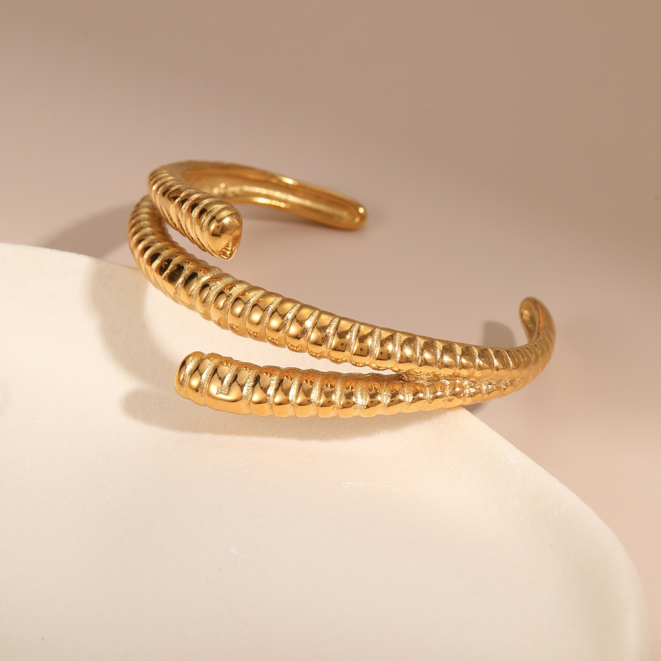 สร้อยข้อมือไทเทเนียมสตีลที่ขายดีที่สุด โดดเด่นด้วยดีไซน์เฉพาะตัว พร้อมแถบสีทองและสีเงิน ให้ความรู้สึกหรูหราเบาๆ