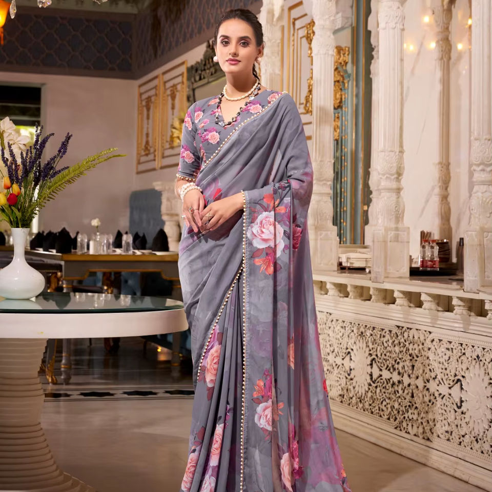 วิธีที่ดีที่สุดในการแสดงลุคที่สง่างามของคุณด้วยผ้าส่าหรีงานปาร์ตี้แบบดั้งเดิมสำหรับผู้หญิงที่ทำจากผ้าจอร์เจตต์สุดอลังการ พร้อมขอบลูกไม้มุก
