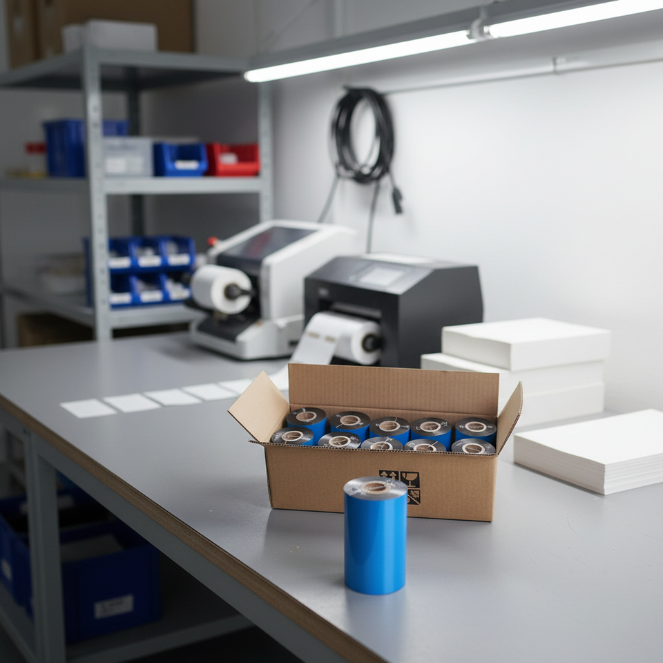 ริบบิ้นถ่ายโอนความร้อนแบบแว็กซ์ 110 มม. x 300 ม. หมึกสีดำด้านนอกแกน 1 นิ้ว สำหรับใช้กับเครื่องพิมพ์ฉลากบาร์โค้ด