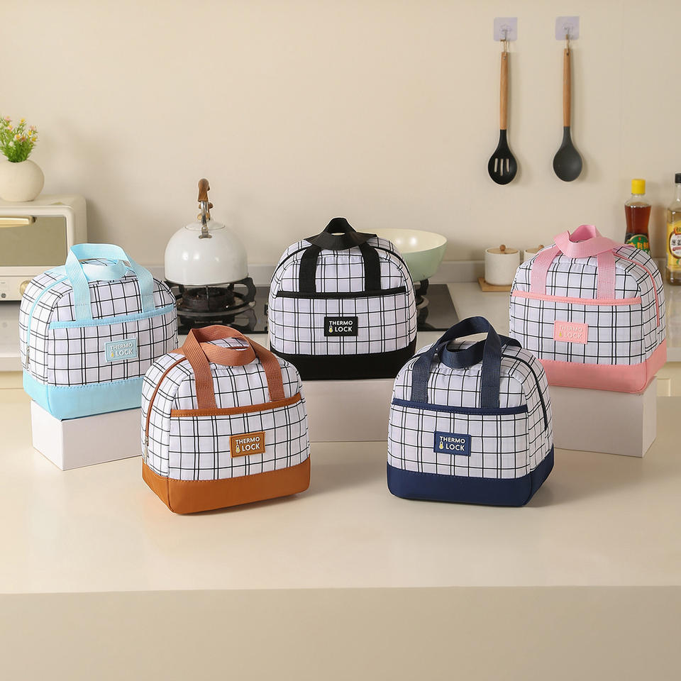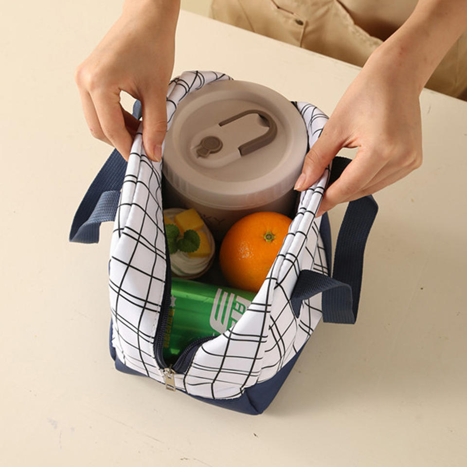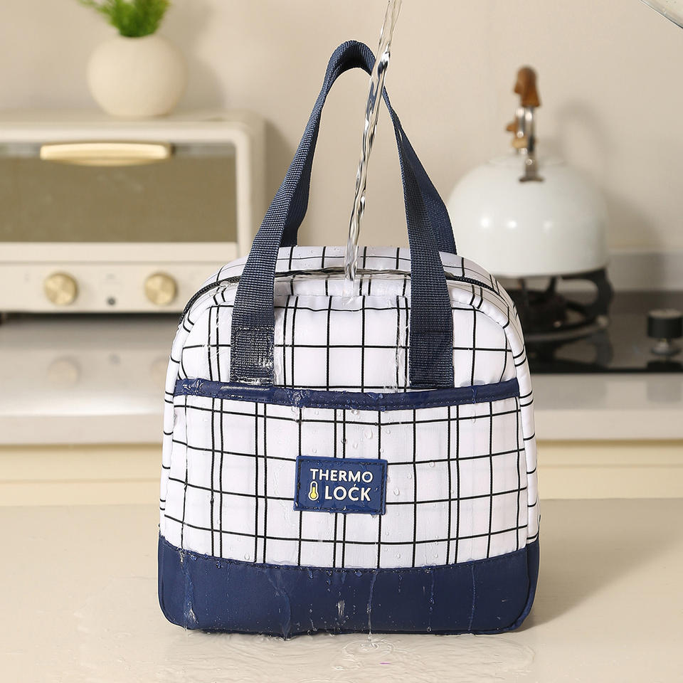 กระเป๋าใส่อาหารกลางวันแบบมีฉนวนกันความร้อนลายตารางสีน้ำเงินกรมท่าและสีดำสำหรับทำงานและปิกนิก