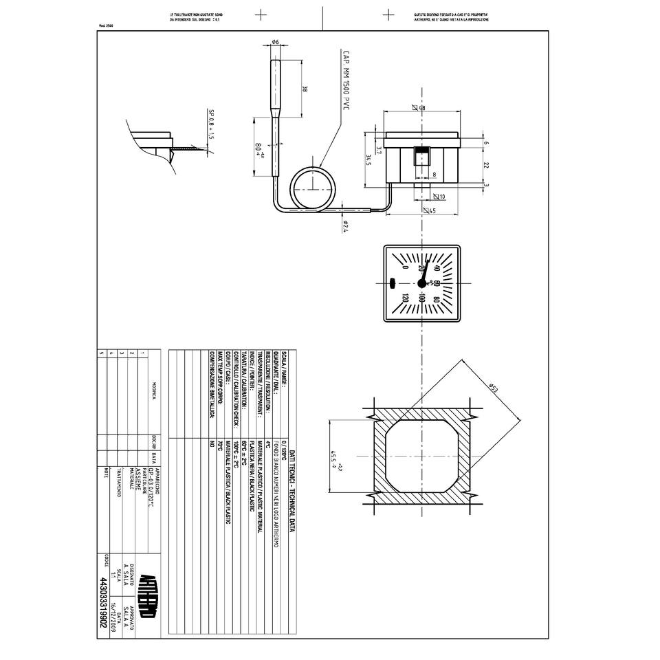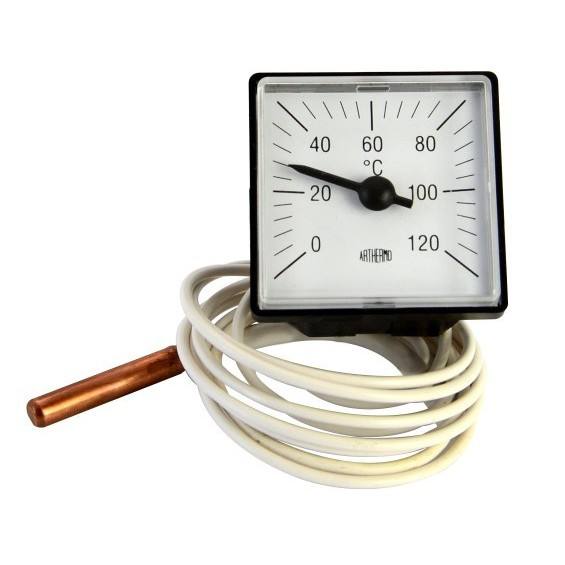 เทอร์โมมิเตอร์ QP 03, ตัวเรือนทรงสี่เหลี่ยม 48x48 มม., เส้นผ่านศูนย์กลางด้านหลัง mm.52, ตัวเรือนเรซินสีดำ, ท่อแคปิลลารี mm 1500 2.4 มม. เคลือบ PVC