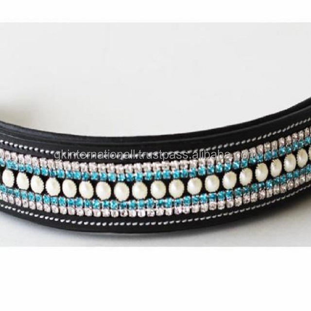 แถบคิ้วหนังม้าบังเหียนสีดำสองชั้นหนาพร้อมแผ่นรองวัวนิ่มเย็บติดและคริสตัลสีขาวและสีฟ้า5แถว