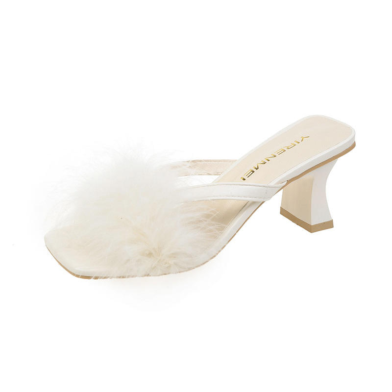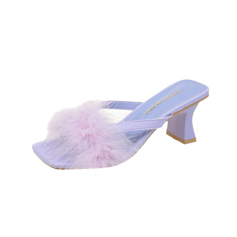 รองเท้าส้นหนาแบบขนเฟอร์ สไตล์แฟรี่ หัวเหลี่ยม ส้นสูงสำหรับผู้หญิง รุ่นใหม่ล่าสุดสำหรับฤดูร้อน เปิดนิ้วเท้า แฟชั่นสไตล์ฝรั่งเศส