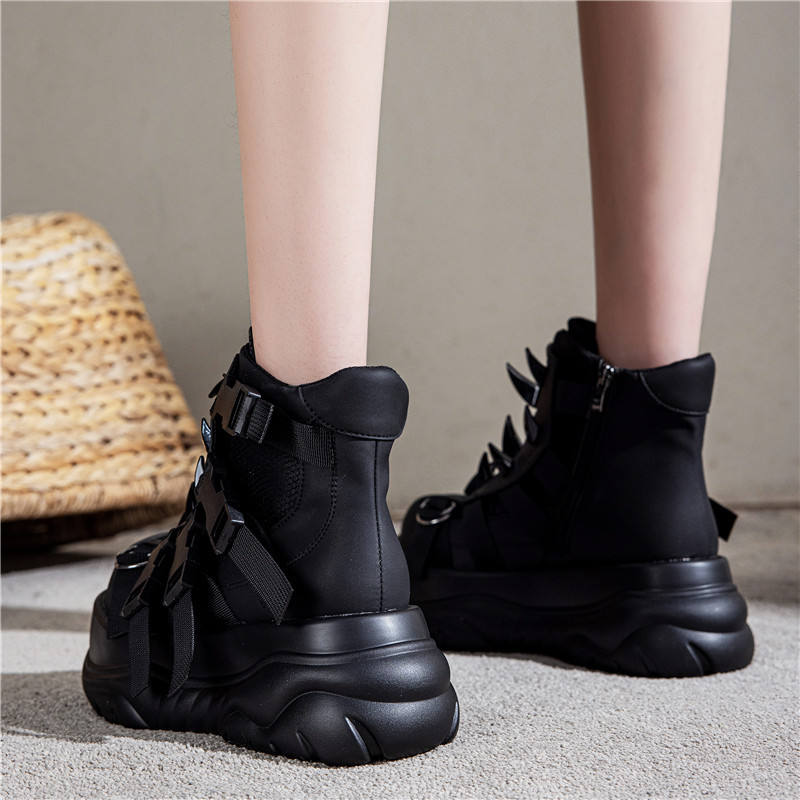 รองเท้าพื้นหนาสุดเทรนด์ - รองเท้าบูทข้อเท้าสไตล์ไซเบอร์พังก์ พื้นหนา สปอร์ต ย้อนยุค ประดับหมุดและตะปูโลหะหนักสำหรับผู้หญิง