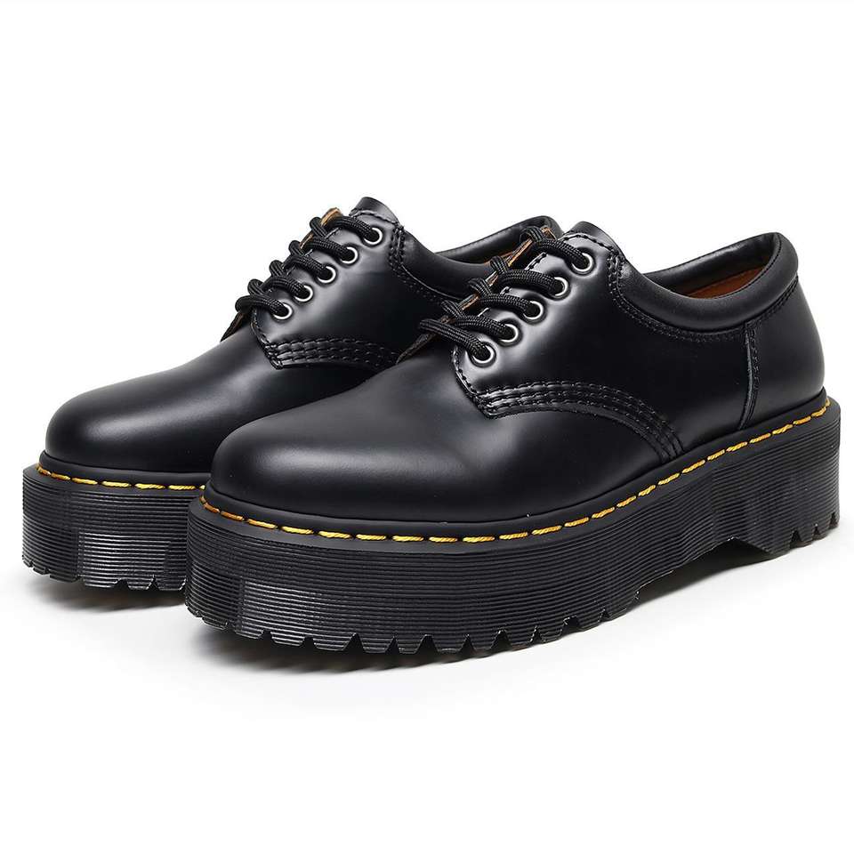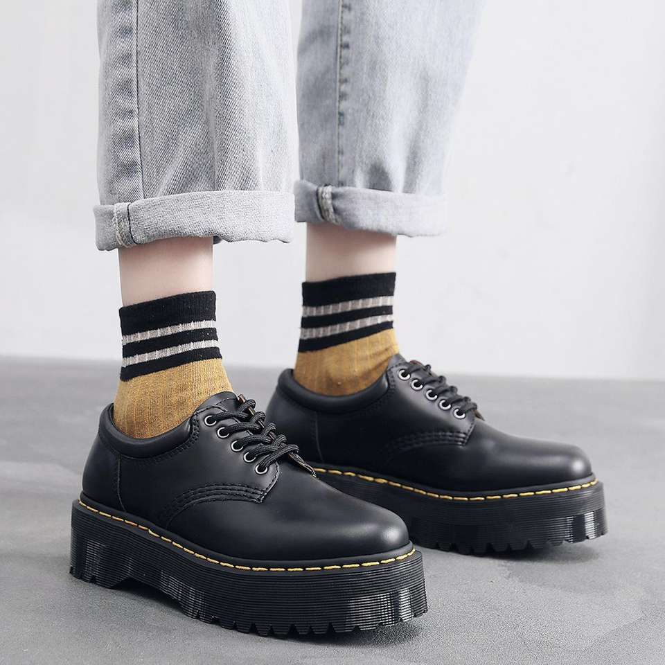 รองเท้าหนังพังก์ส้นหนา5รูสำหรับผู้หญิง, รองเท้าหนังแท้ส้นเตี้ยรองเท้าลำลองหัวมนสไตล์อังกฤษ