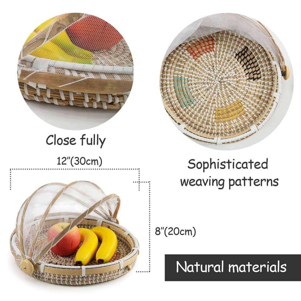 ถาดสานจากหญ้าทะเลธรรมชาติ พร้อมฝาปิดตาข่ายพับได้ สำหรับปกป้องอาหาร ขายส่งโดยเทียนถาน แฮนด์คราฟต์