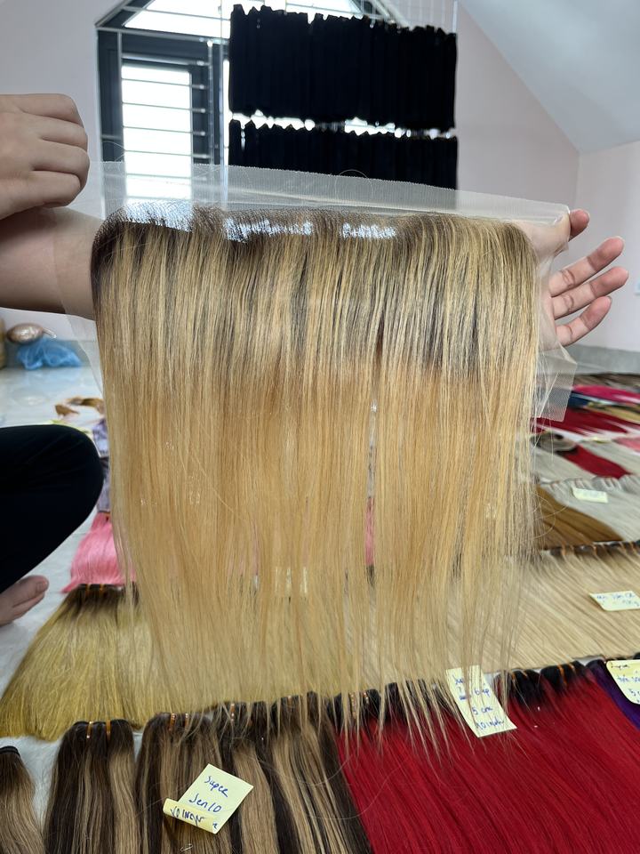 วิกผมด้านหน้าลูกไม้บางเอชดีโปร่งแสงสีบลอนด์ลูกไม้สวิสสีพื้นหน้าจากเวียดนาม