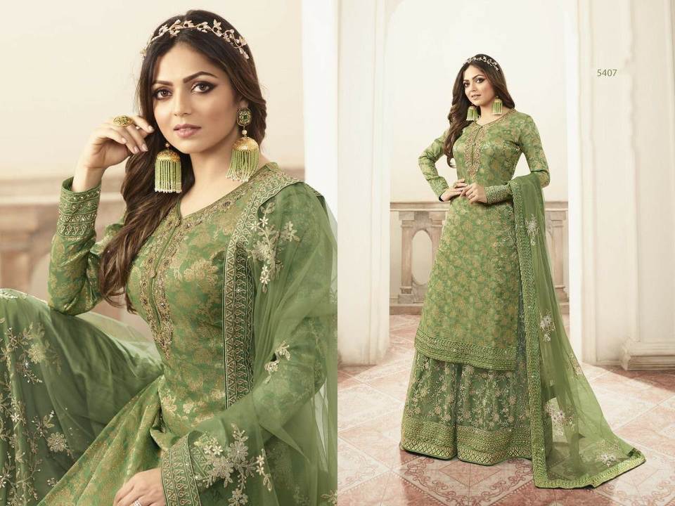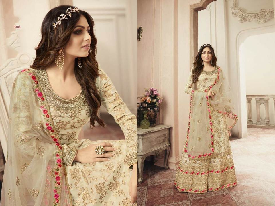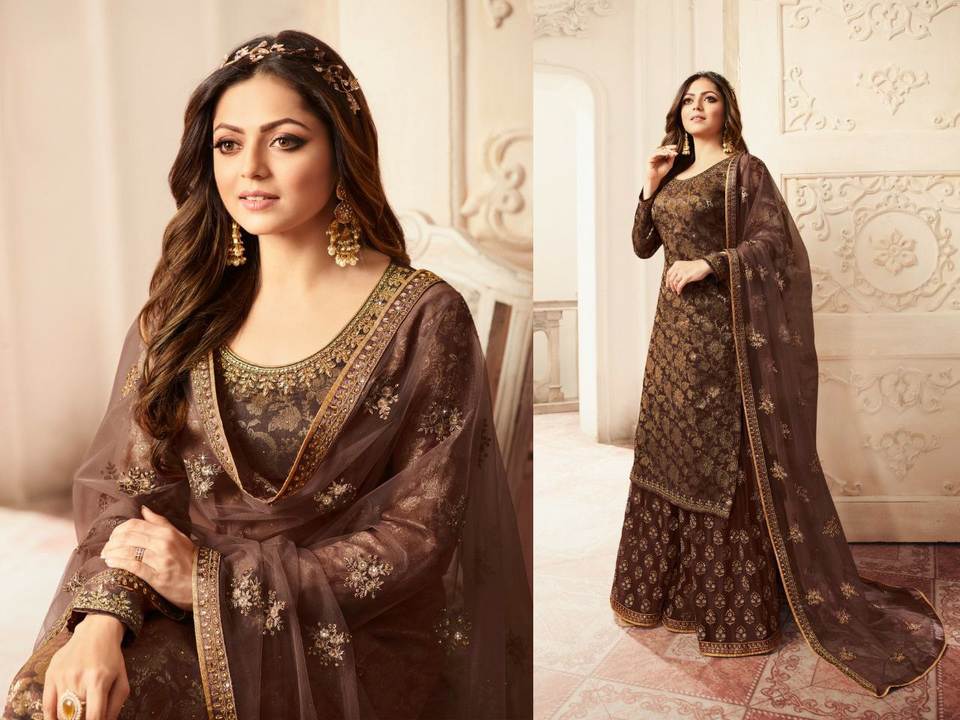 ชุดซาลวาร์ Kameez สำหรับเจ้าสาวทำจากผ้าไหมแจ็คการ์ดและวัสดุจอร์เจ็ตที่นำมารวมกันเป็นชุดปักลายพลาสโซ