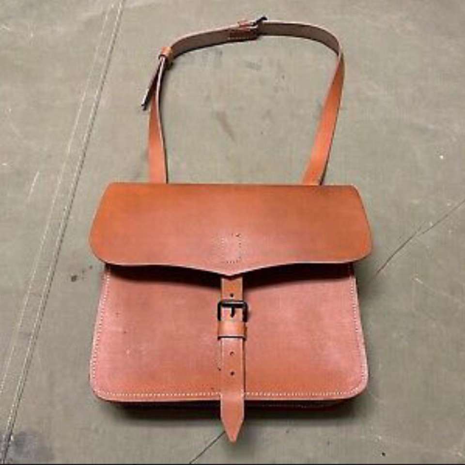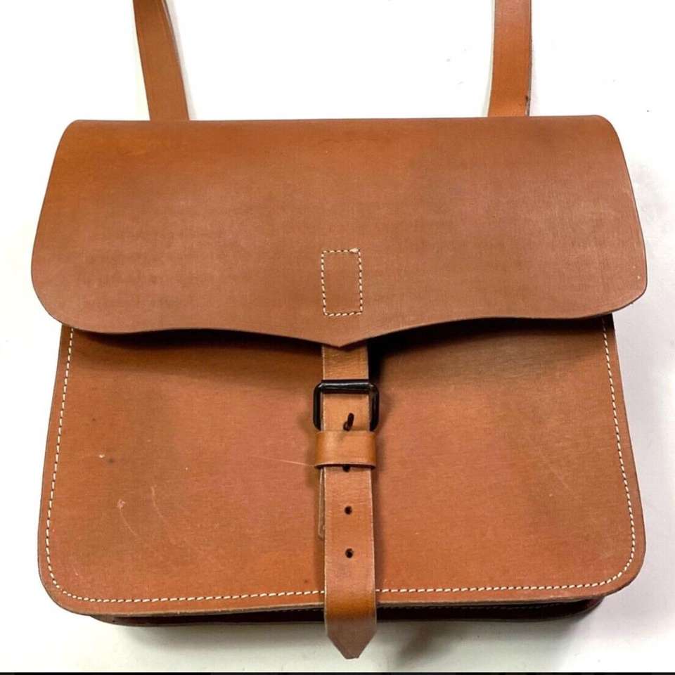 นี่คือกระเป๋าสะพายสำหรับทหารปืนใหญ่ยุคสงครามกลางเมือง ทำจากหนังฟอกฝาดสีน้ำตาลอ่อนเข้ม