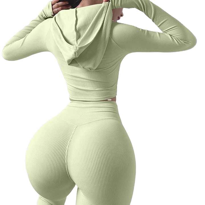 ชุดออกกำลังกายผู้หญิงแบบมีฮู้ด ผ้ารัดรูป กระชับสัดส่วน กางเกงขาสั้นเอวสูง ชุดโยคะ ชุดกีฬา ซับเหงื่อ