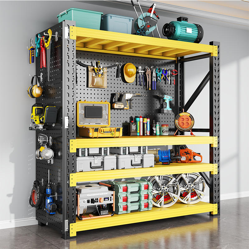 ชั้นวางของในโรงรถ Three Arrows แบบ 4 ชั้น ชั้นวางเหล็กสำหรับงานหนัก พร้อมแผงเพ็กบอร์ดสำหรับจัดเก็บอุปกรณ์ในโรงงานและห้องใต้ดิน