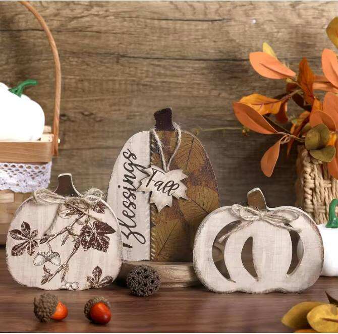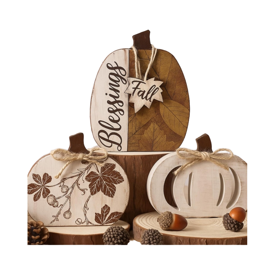 ของตกแต่งฤดูใบไม้ร่วงรูปฟักทองไม้สามชิ้นแบบแขวน สไตล์คลาสสิกสำหรับบ้านไร่ พิมพ์ดิจิทัลด้วยเทคนิค Letterpress สำหรับวันขอบคุณพระเจ้า