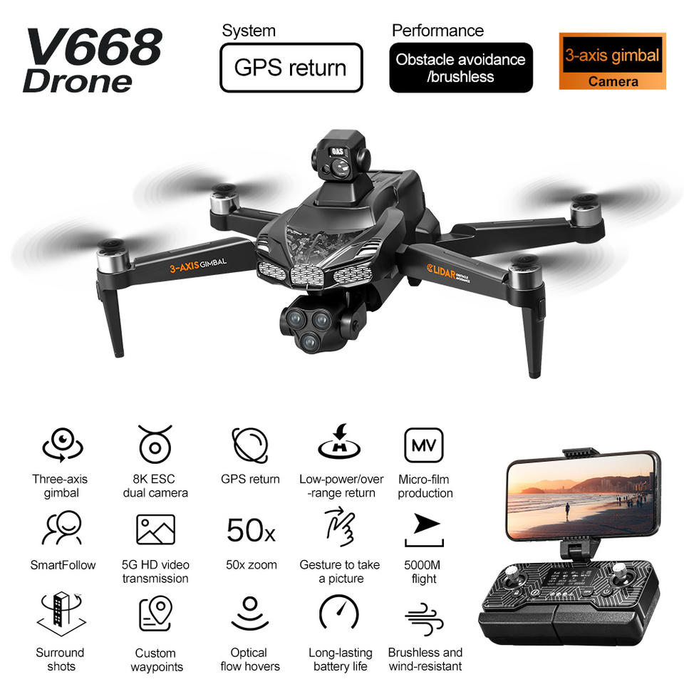 กิมบอลสามแกน, ระบบ GPS นำกลับจุดเริ่มต้น, การถ่ายภาพทางอากาศ, โดรนของเล่นพับได้รุ่น V668