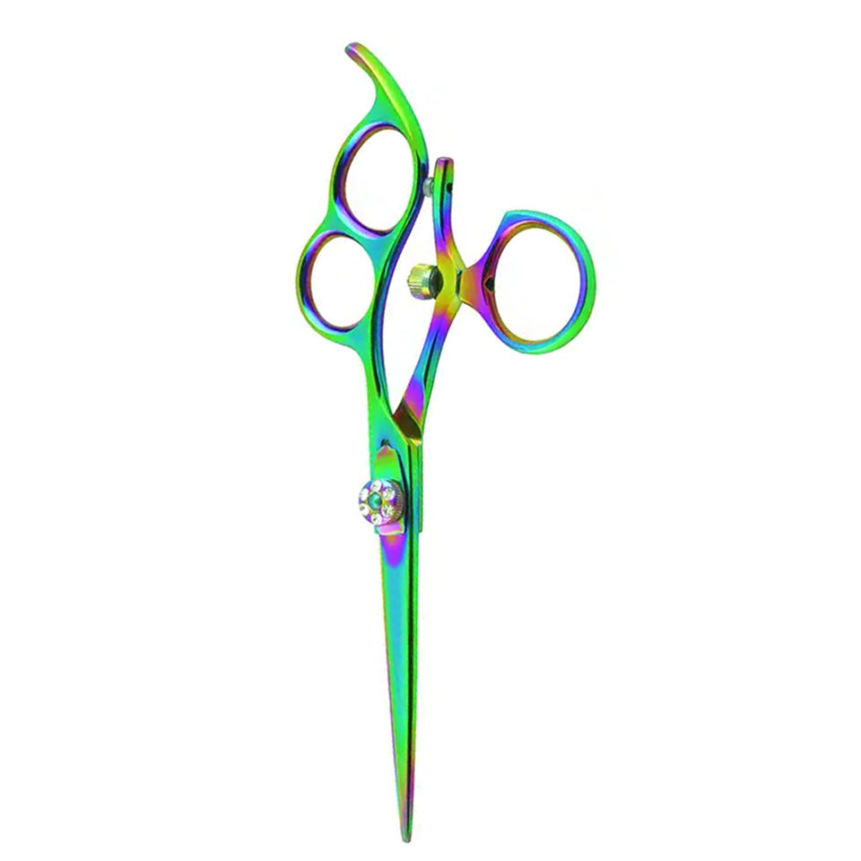 กรรไกรตัดผมสามนิ้วสีรุ้งสำหรับช่างตัดผมเยอรมันที่วางนิ้วเครื่องมือความงามใบมีดสแตนเลสคงที่