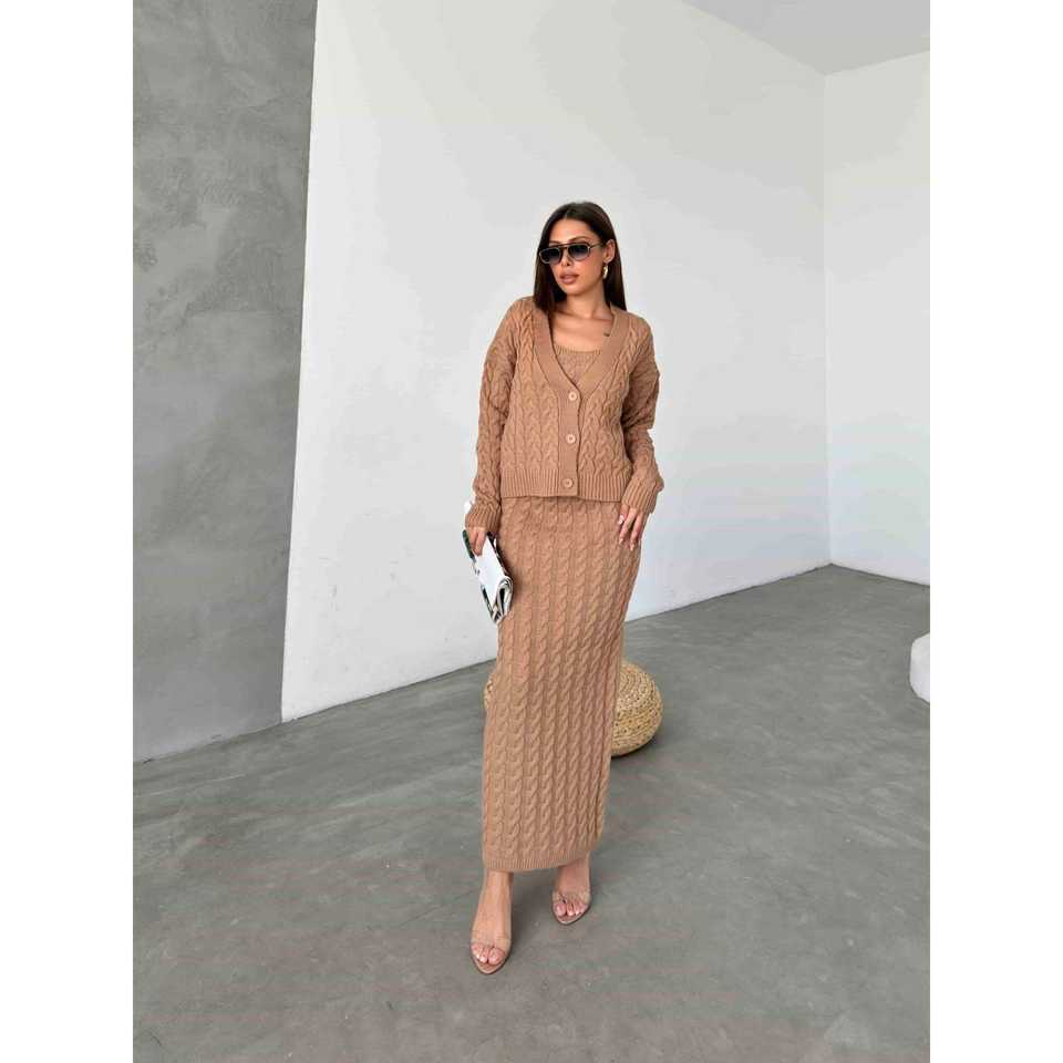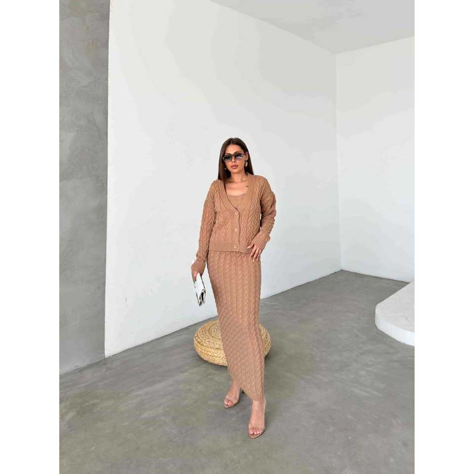 ชุดเสื้อถักสามชิ้น ชุดเสื้อสเวตเตอร์ผู้หญิง คาร์ดิแกนถักลายเคเบิ้ลสีน้ำตาล กระโปรง ไซส์ S
