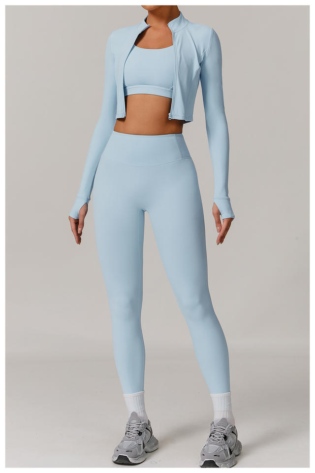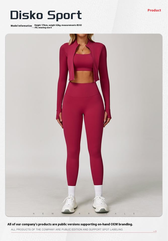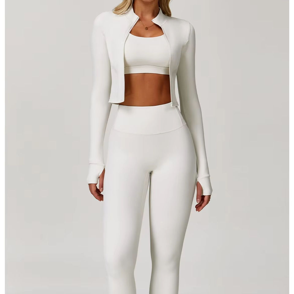 ชุดโยคะ 3 ชิ้น พร้อมโลโก้ปรับแต่งได้ที่เอว เสื้อแจ็คเก็ตซิปเต็มตัวสำหรับผู้หญิง สปอร์ตบราแบบคอวี กางเกงขายาวทรงบานยกกระชับสะโพก