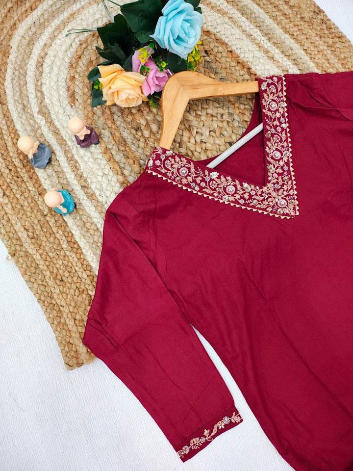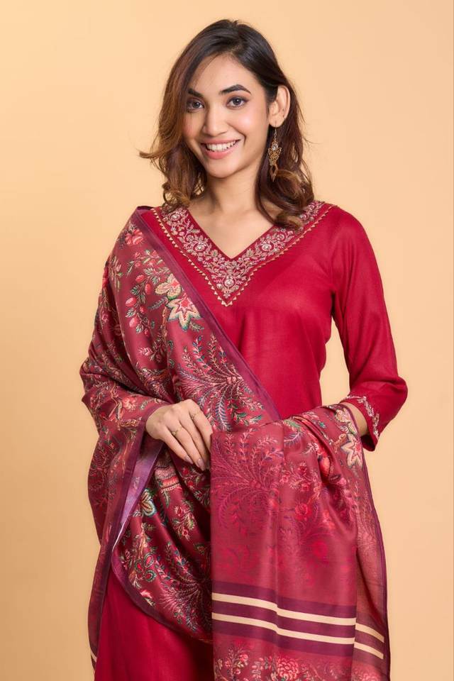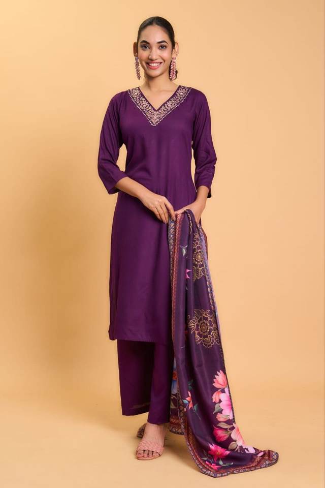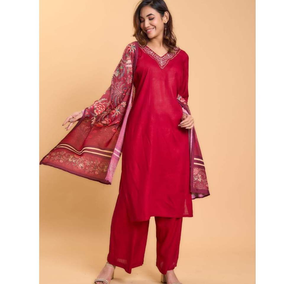 ชุดคุर्ติผ้าเรยอนเนื้อสลับแบบแขนสามส่วน พร้อมกางเกงพลลาซโซ ผ้าคอตตอนผสมด้านใน คอวี ผ้าคลุมไหล่พิมพ์ลาย มีไซส์ตั้งแต่ S ถึง 3XL