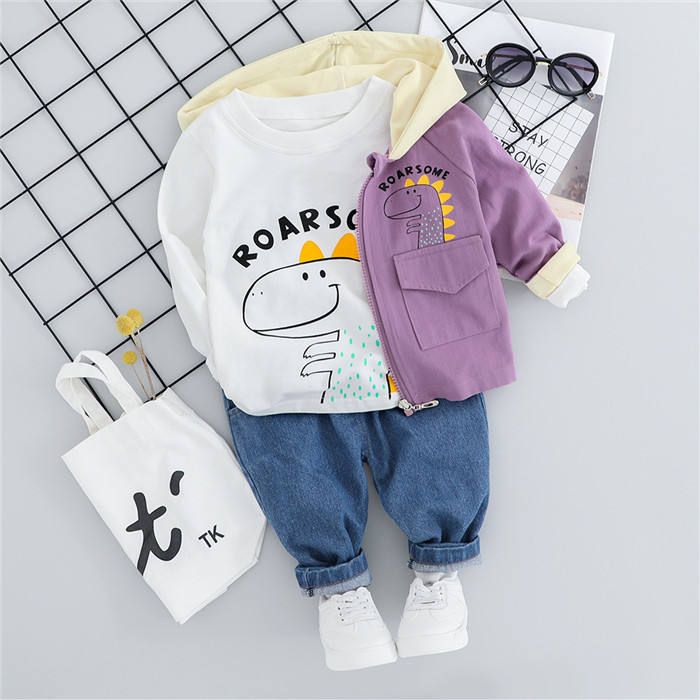 ชุดเสื้อเชิ้ตไดโนเสาร์ลำลองสามชิ้น กางเกงยีนส์โรบินสำหรับเด็ก และเสื้อฮู้ดดี้แขนสีต่างกันจากโรงงานจีน