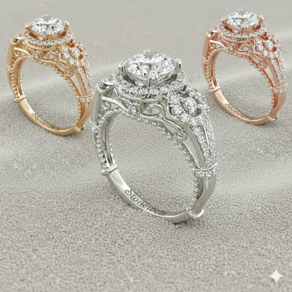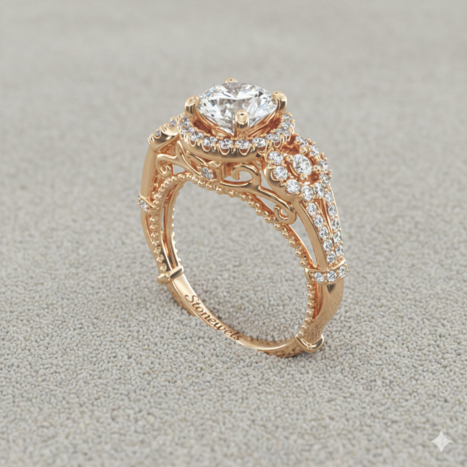 แหวนหมั้นสไตล์วินเทจประดับด้วยหินสามเม็ด