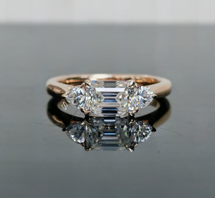 สามหินLab Grownเพชรแหวนหมั้นตะวันออกตะวันตกCVDแหวนแต่งงาน2.20 Ctwมรกตตัดเพชรแหวนเจ้าสาวสีเหลืองทอง