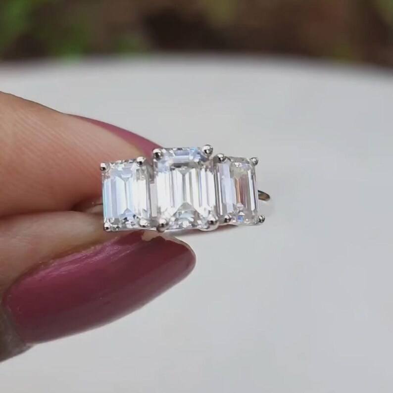 แหวนเพชรทรงมรกตมอสซาไนต์สามเม็ดสำหรับผู้หญิง เงินแท้ 925 ของแท้ เหมาะสำหรับเป็นของขวัญวันครบรอบวันเกิดสำหรับคนรัก