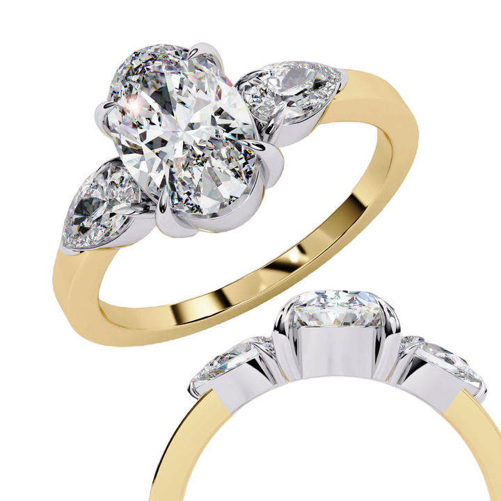 แหวนเพชรรูปวงรีและลูกแพร์สามชิ้นสำหรับปลูกในห้องแล็บหรูหรายั่งยืนไร้กาลเวลา