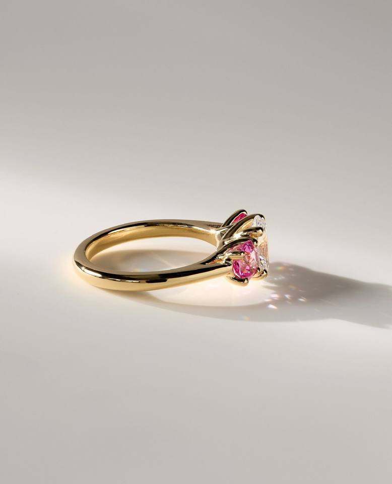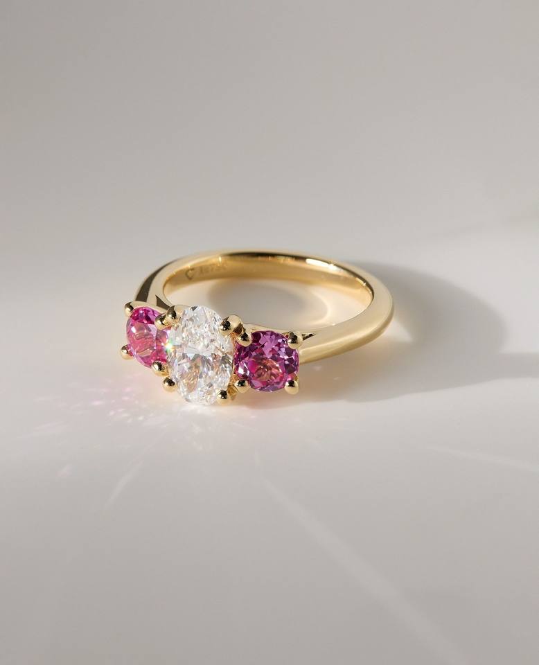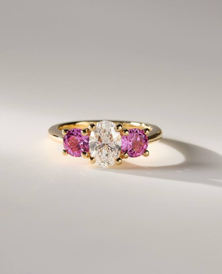 แหวนเพชรรูปไข่สามเม็ด ประดับด้วยพลอยสีชมพู ตัวเรือนทอง 14k สีเหลือง / ขาว / โรสโกลด์