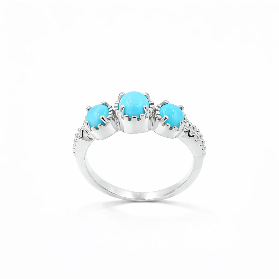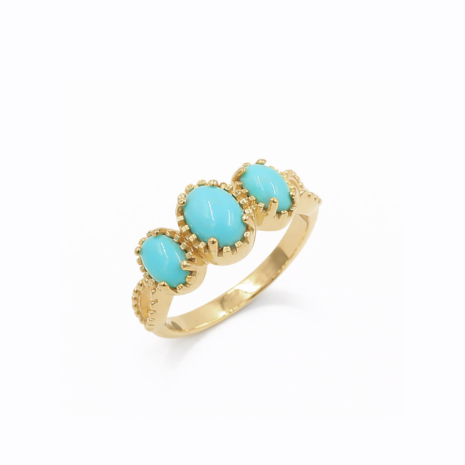 แหวนเงินแท้ 925 ชุบทองคำขาว ประดับด้วยพลอยเทอร์ควอยซ์ทรงรีแบบสามเม็ด ดีไซน์สลักลาย