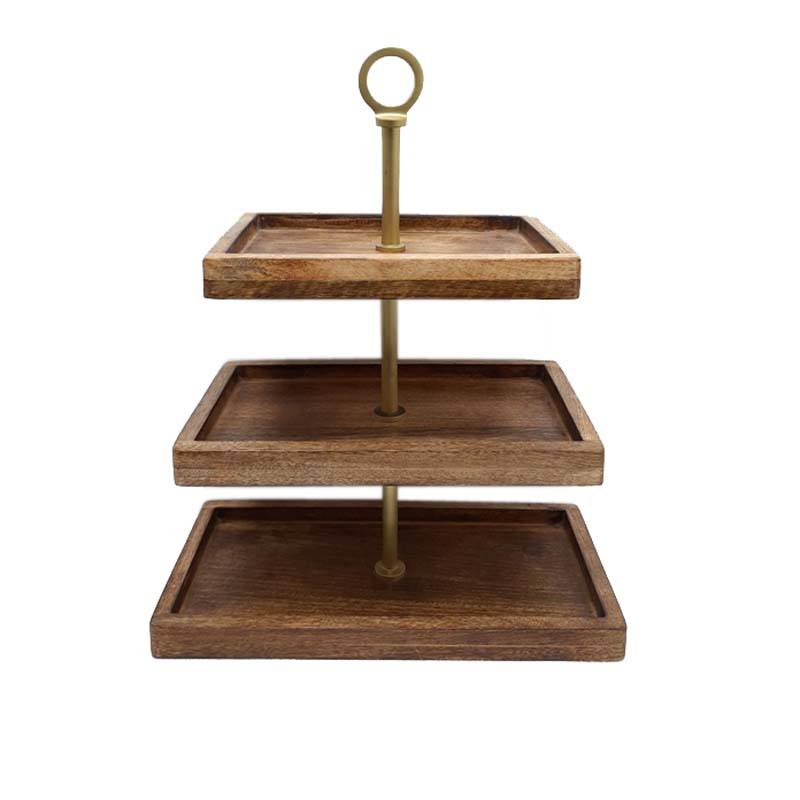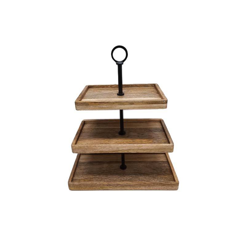 ชั้นวางเค้กสามชั้นทำจากไม้ธรรมชาติและโลหะสีดำถาดเหล็กรูปทรงสี่เหลี่ยมผืนผ้าสำหรับร้านอาหาร