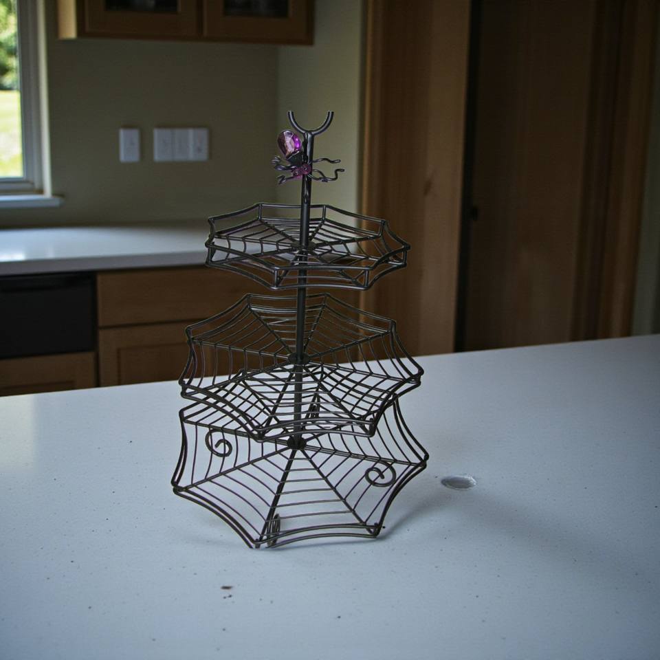 ชั้นวางใยแมงมุมเหล็กสามชั้นพร้อมแมงมุมอัญมณีสีม่วงสีดำหรูหราชั้นวางโชว์ขนมหวานฮาโลวีนสำหรับตกแต่งงานปาร์ตี้ที่น่ากลัว