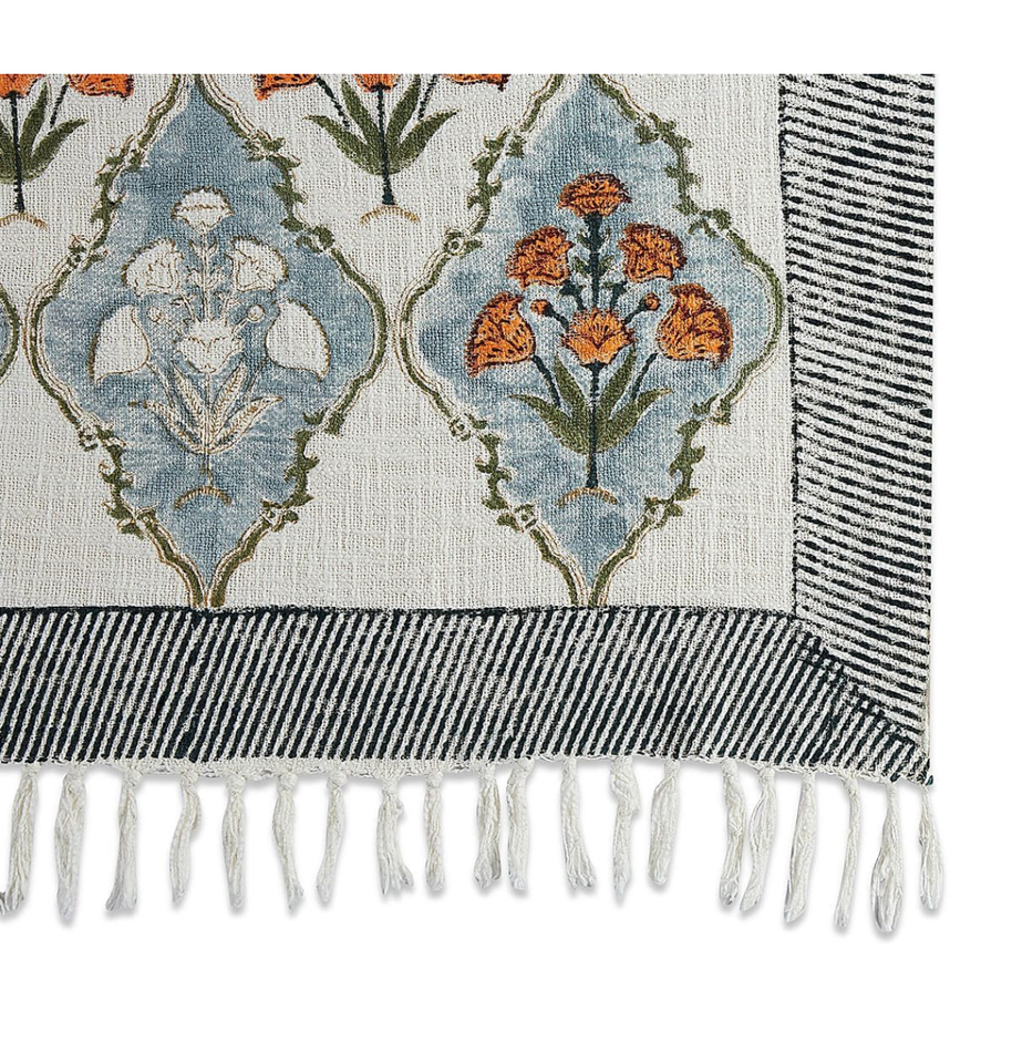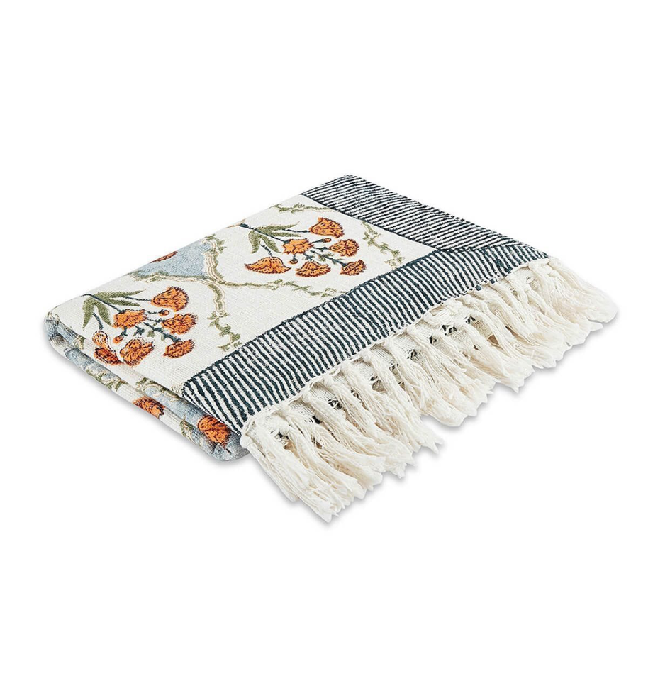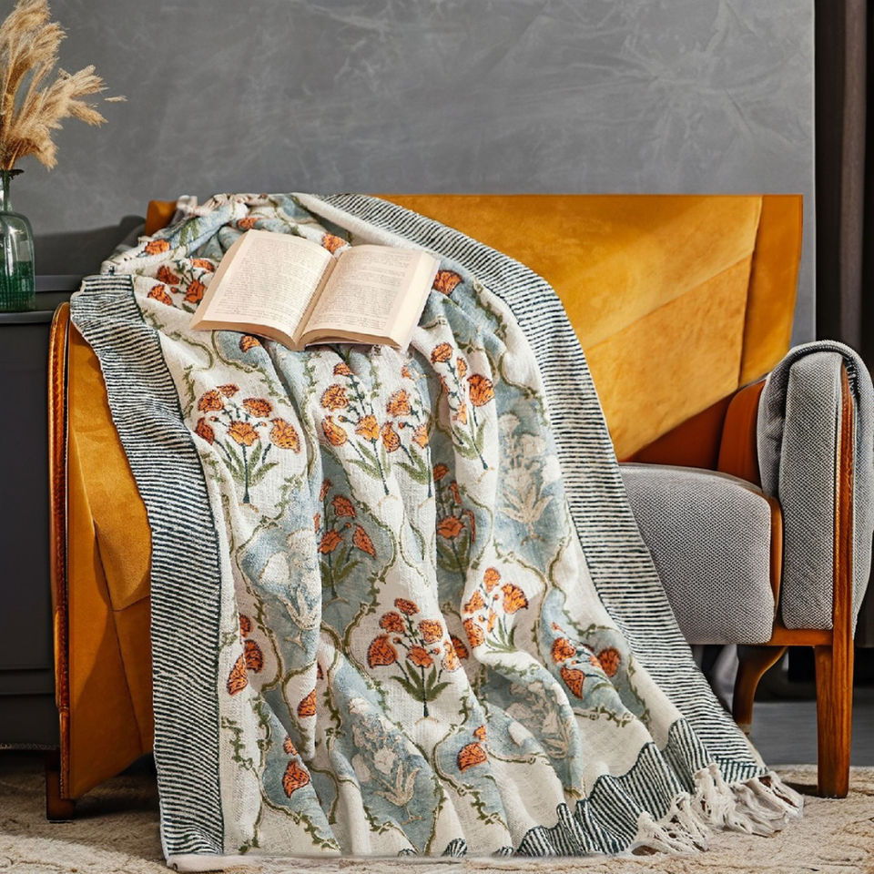 ผ้าห่มพิมพ์ลายดอกไม้สีฟ้าส้ม ขอบลายทาง เป็นมิตรกับสิ่งแวดล้อม ระบายอากาศได้ดี เป็นมิตรกับผิว ชุดเครื่องนอนทันสมัย ตกแต่ง