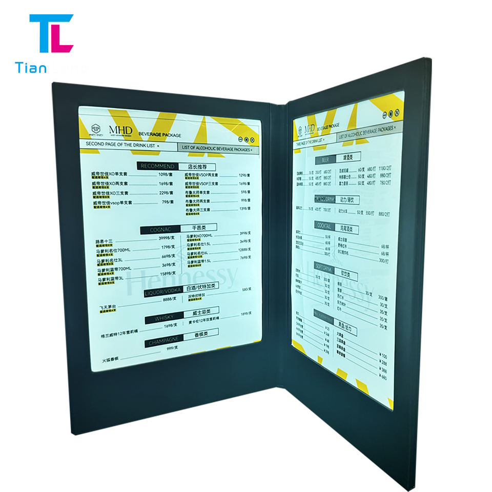 TIANLANG ที่มีคุณภาพสูงหนัง PU เมนูแทรกสองหน้ามุมมองแสง LED แสดงเมนูร้านอาหารสำหรับโรงแรมและร้านอาหาร