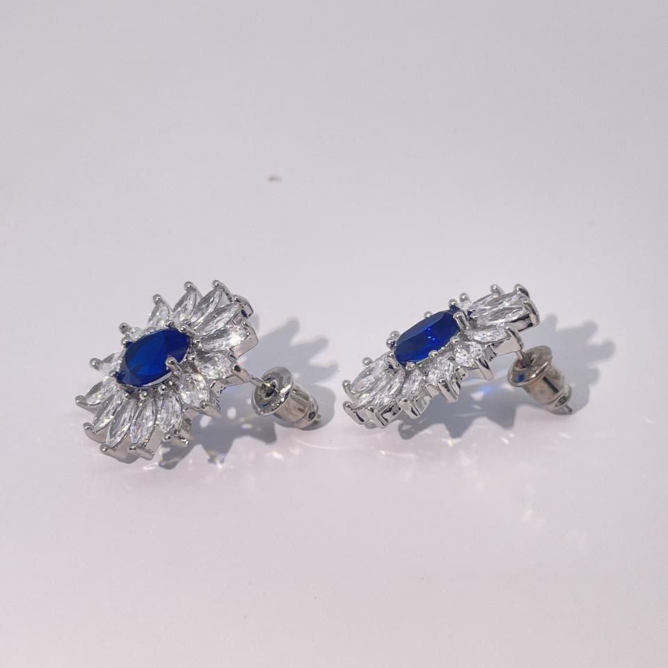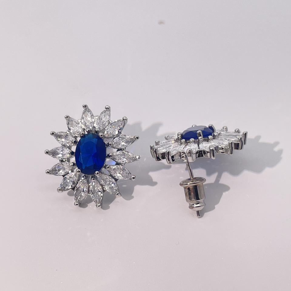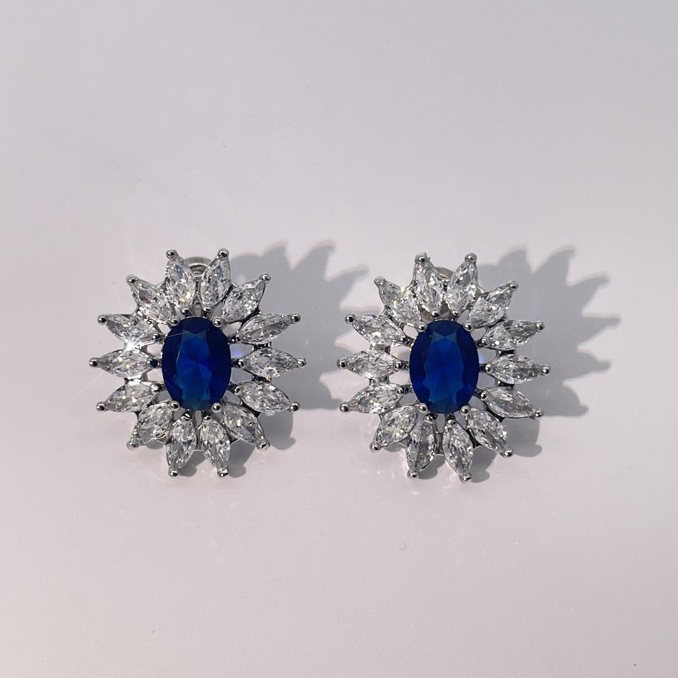 ต่างหูทรงเรขาคณิตสำหรับผู้หญิง ดีไซน์คลาสสิกและหรูหราจาก Tianyu Gems ตัวเรือนทองเหลืองชุบทอง ประดับด้วยเพทายทรงรีสีน้ำเงิน