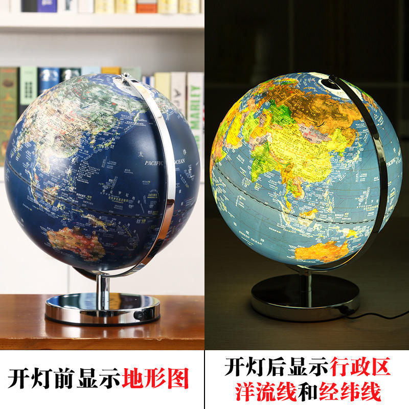 แผนที่โลก Tianyu Globe ขนาด 32 ซม. ฐานโลหะสีน้ำเงิน พร้อมไฟส่องสว่าง แผนที่โลกเพื่อการศึกษา ดีไซน์ทันสมัย วัสดุพลาสติกและโลหะ รูปทรงกลม ลวดลายสวยงาม
