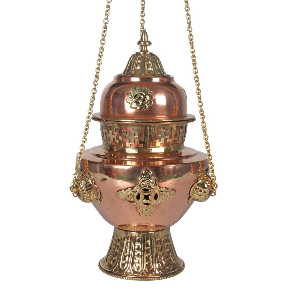เตาเผาเครื่องหอมแบบแขวนทิเบต ทำด้วยมือในเนปาล - เตาเผาเครื่องหอมสำหรับสวดมนต์ทำจากโลหะ