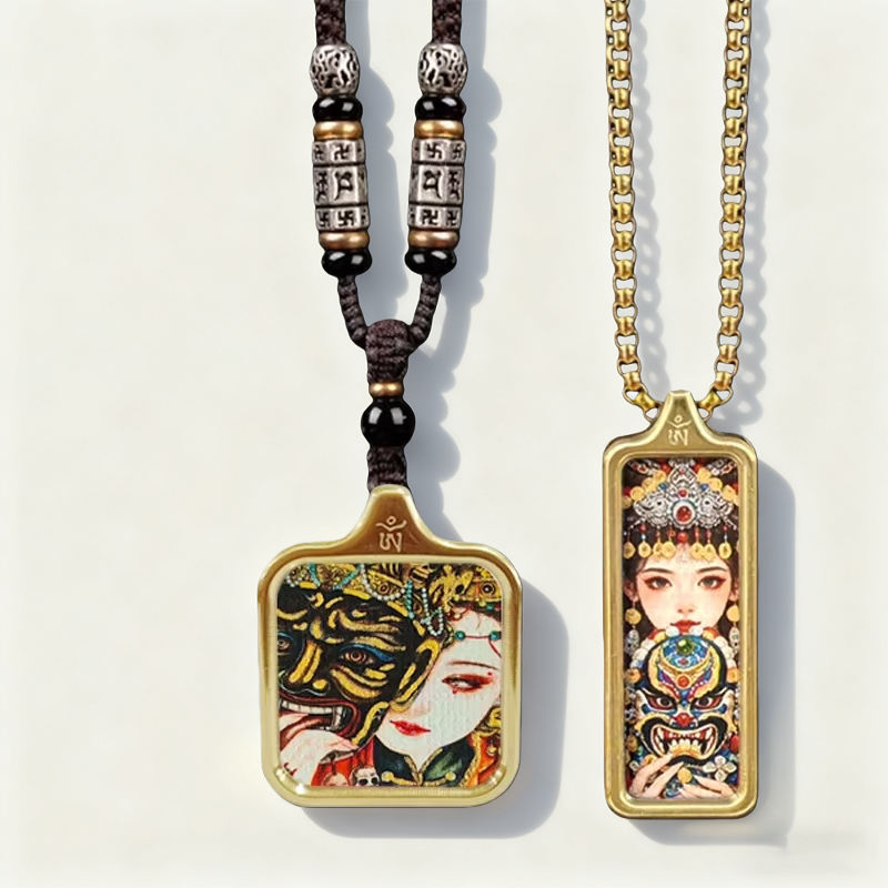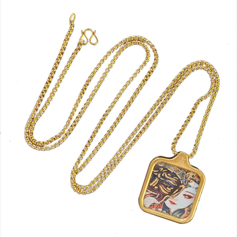 จี้พระเครื่องสไตล์ทิเบต จัลลิลัม ห้าพระเจ้าแห่งความมั่งคั่ง สีเหลือง รูปสุนัขจิ้งจอก ป้องกันภัย วาดด้วยมือ ประดับทอง พร้อมกล่องทองคำ