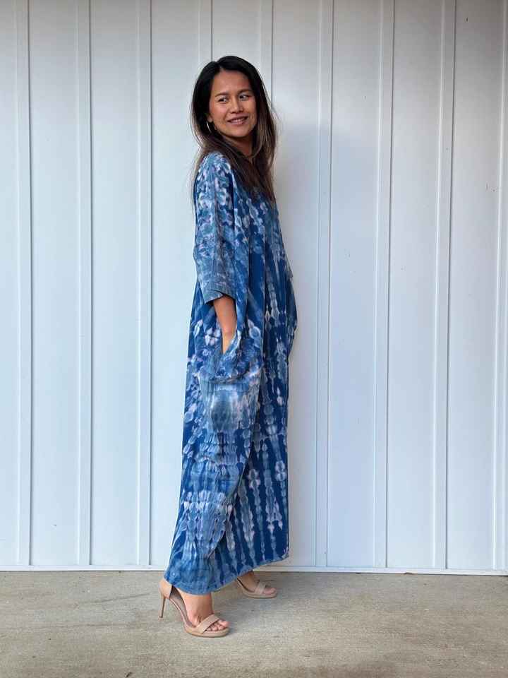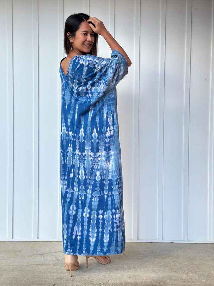 ชุดเดรสผ้าฝ้ายย้อมสีแบบไทไดสีน้ำเงินสำหรับผู้หญิง ชุดคลุมชายหาดสำหรับฤดูร้อน ชุดเดรสสำหรับเที่ยวทะเล