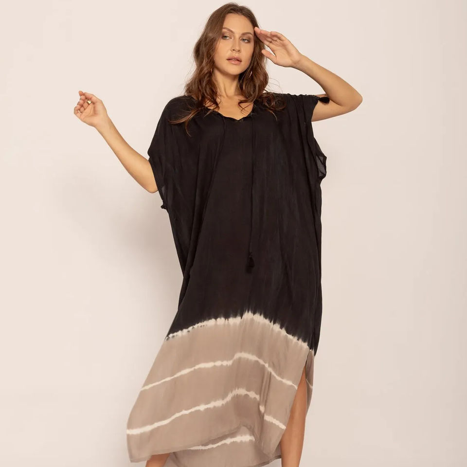 ชุดเดรสยาวมัดย้อมลายดอกไม้คอวีสไตล์โบฮีเมียนขนาด XL 100% ผ้าเรยอนแขนคลุมชายหาดระบายอากาศได้สำหรับวันหยุดฤดูร้อน