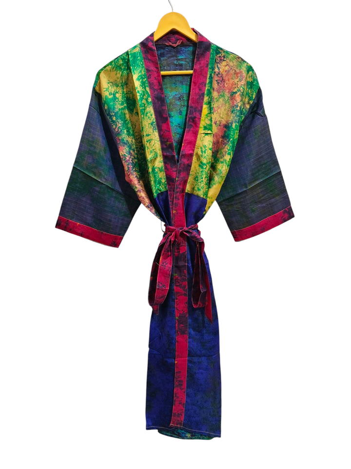มัดย้อมแฮนด์เมดเสื้อคลุมชุดเจ้าสาวของขวัญเสื้อคลุมปาร์ตี้ชายหาดชุดกิโมโนผ้าไหมส่าหรีพิมพ์ลายอินเดีย
