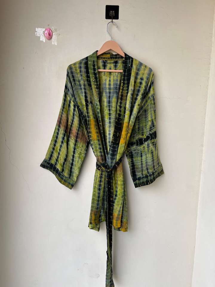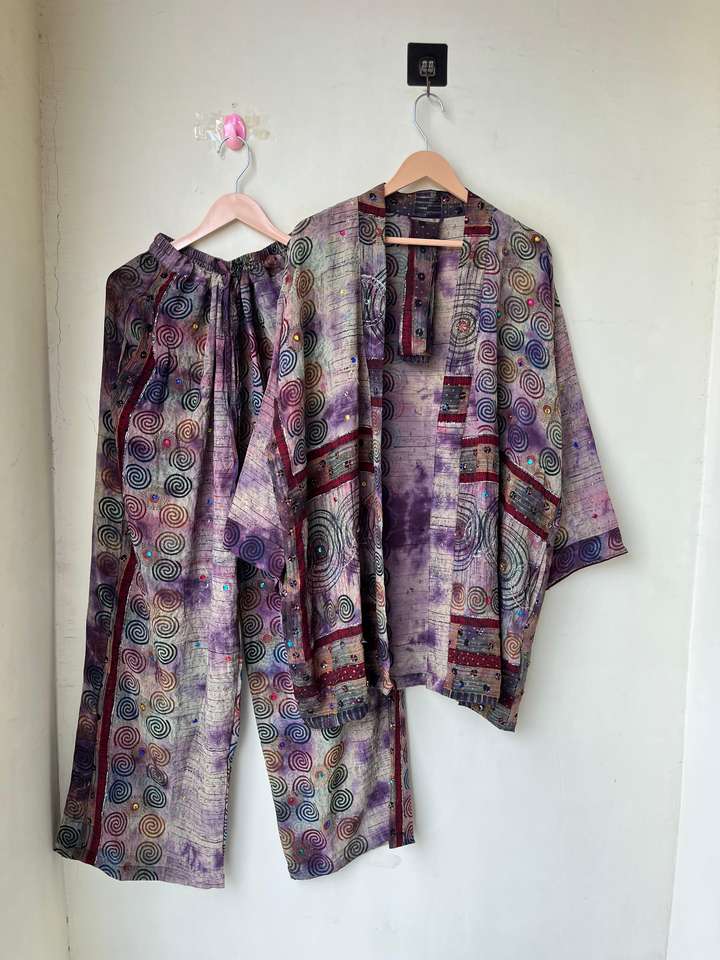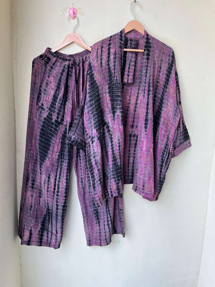 ชุดนอนกิโมโนผ้าไหมมัดย้อมทำมือเสื้อคลุมหรูหราโบฮีเมียนเลานจ์ชุดชุดนอนของขวัญวันเกิดสำหรับเสื้อคลุมผ้าไหมของเธอพร้อมกางเกง