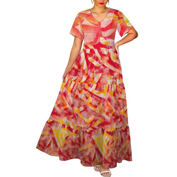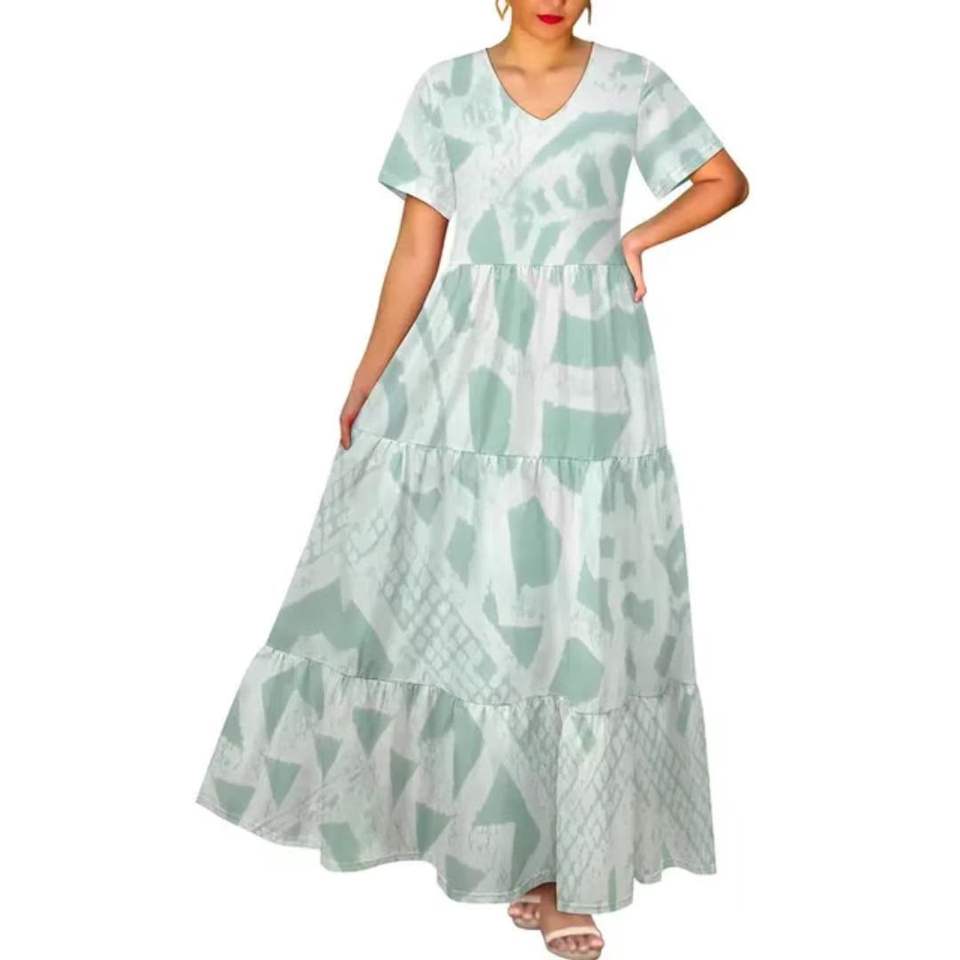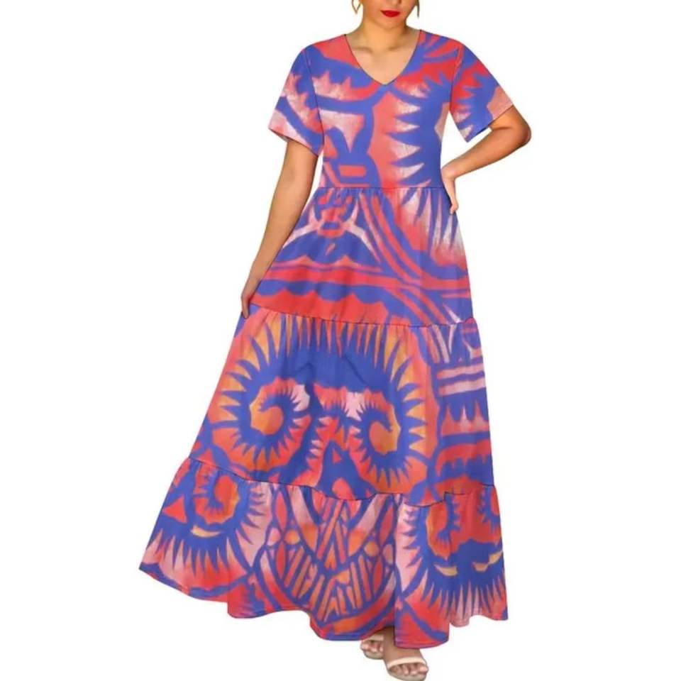ชุดเดรสยาวพิมพ์ลายชนเผ่าโพลีนีเซียนแบบไท-ได ดิจิตอลพิมพ์ลาย คอวี เอวสูง แขนสั้น ทรงหลวม สไตล์ลำลองสำหรับฤดูร้อน